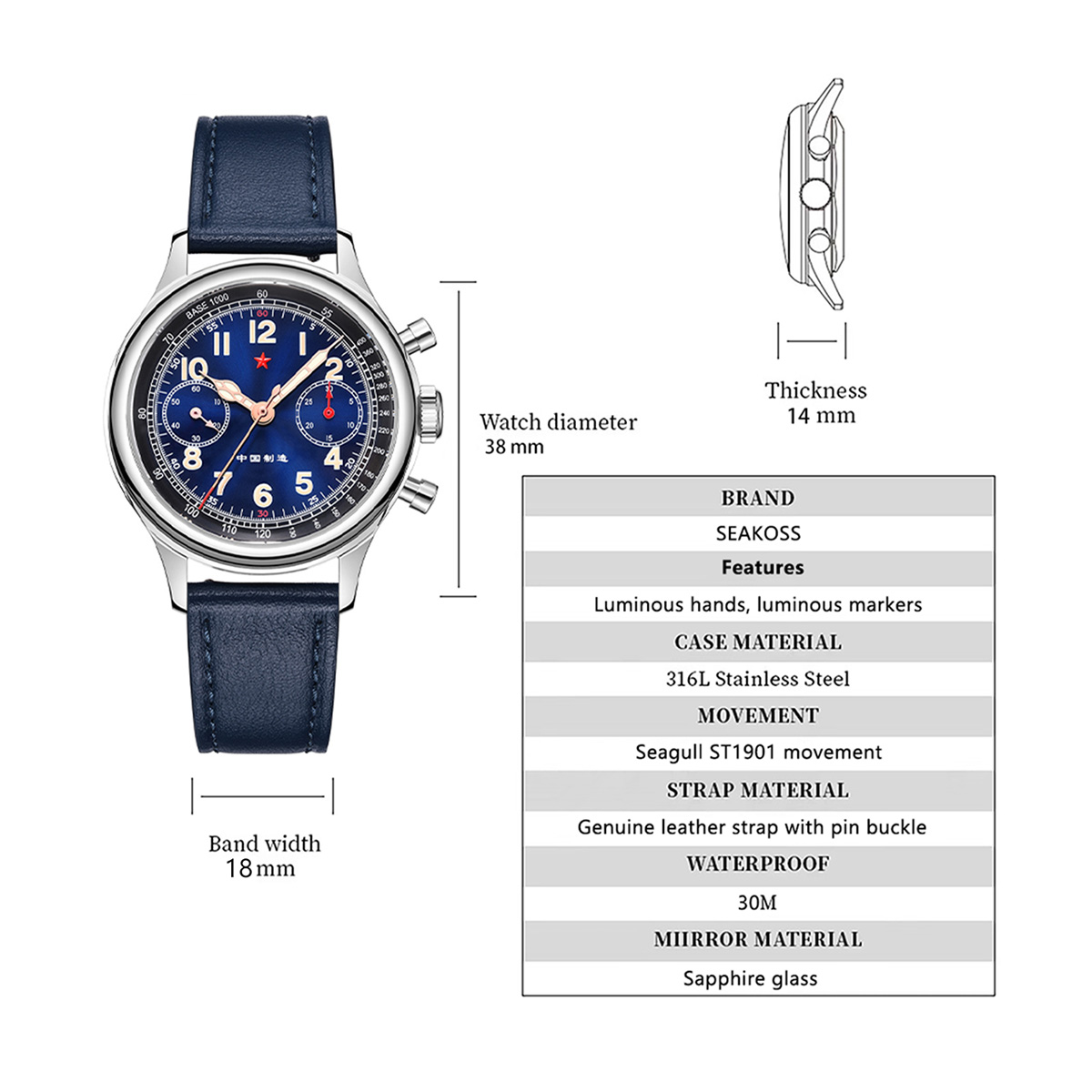 | Movement | Seagull ST1901 (without swan-neck spring) | Case Thickness | 14mm |
